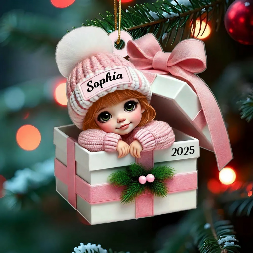 Surprise your little one with a magical Christmas ornament that’s as joyful as they are! This charming design features a cozy child peeking out of a beautifully wrapped gift box, ready to bring extra holiday cheer to your tree.