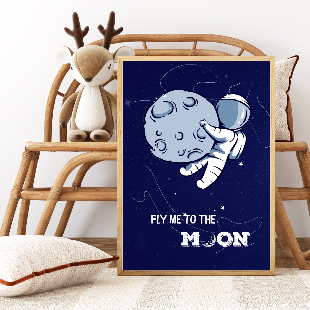 Bring the magic of outer space into your home with this delightful "Fly Me to the Moon" wall art. Featuring an adorable astronaut clutching the moon against a deep blue cosmic background, this artwork is perfect for dreamers, space enthusiasts, or anyone who loves imaginative decor.