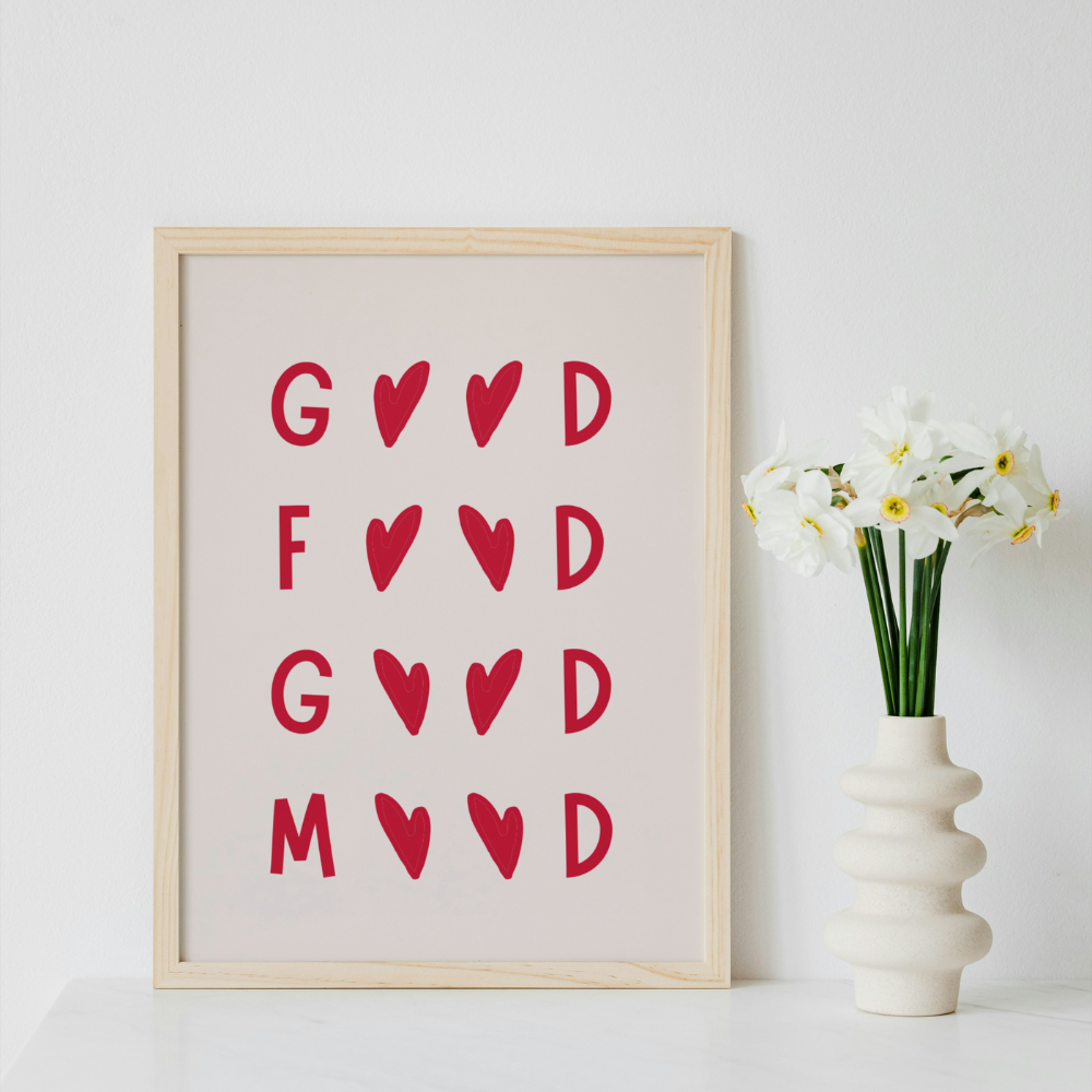 Bring positivity and charm into your space with this "Good Mood" Minimalist Heart Wall Art Print. Featuring bold red hearts and clean typography on a soft, neutral background, this modern design instantly uplifts any room. Perfect for creating a cozy and inviting atmosphere, it’s an ideal accent piece for your bedroom, living room, office, or gallery wall.