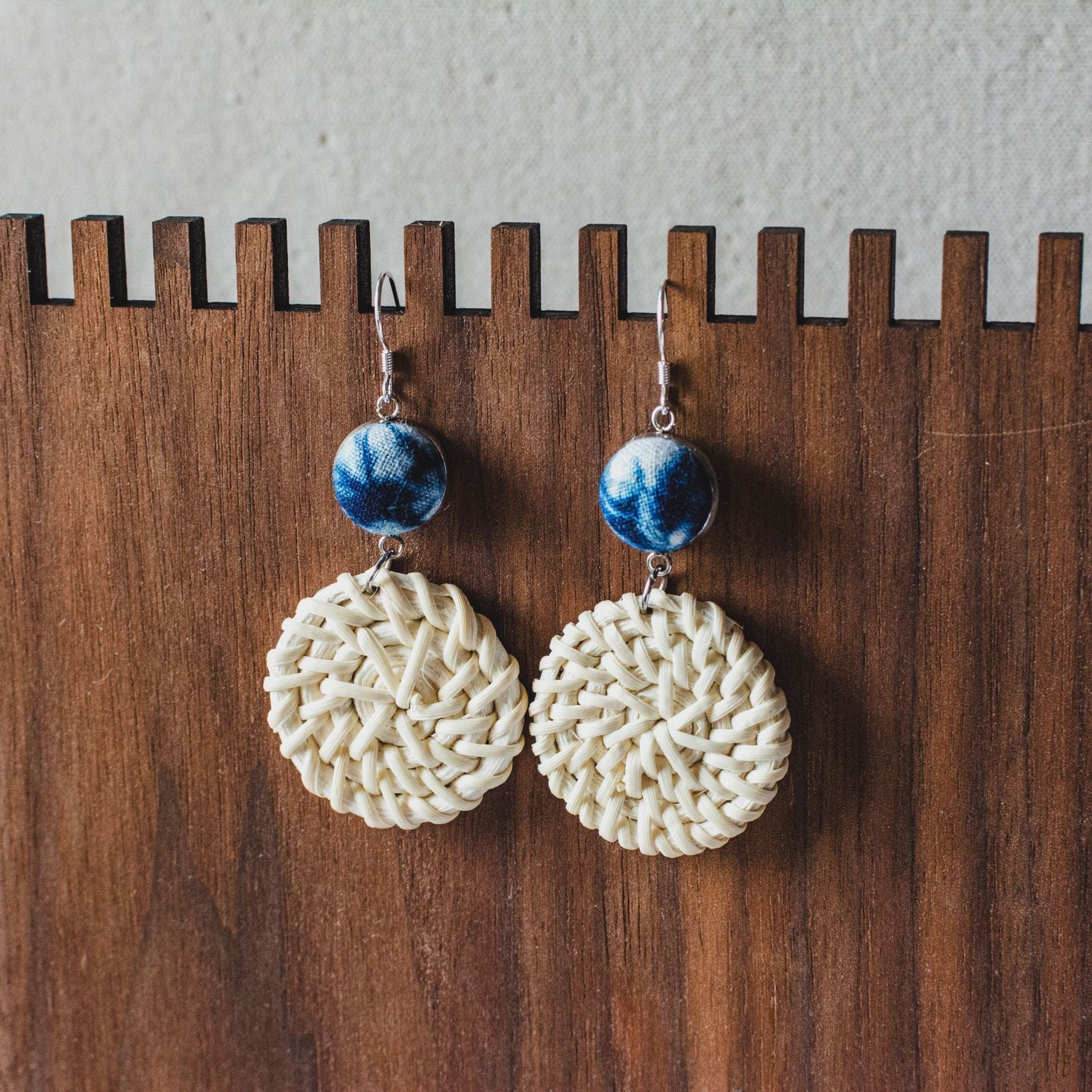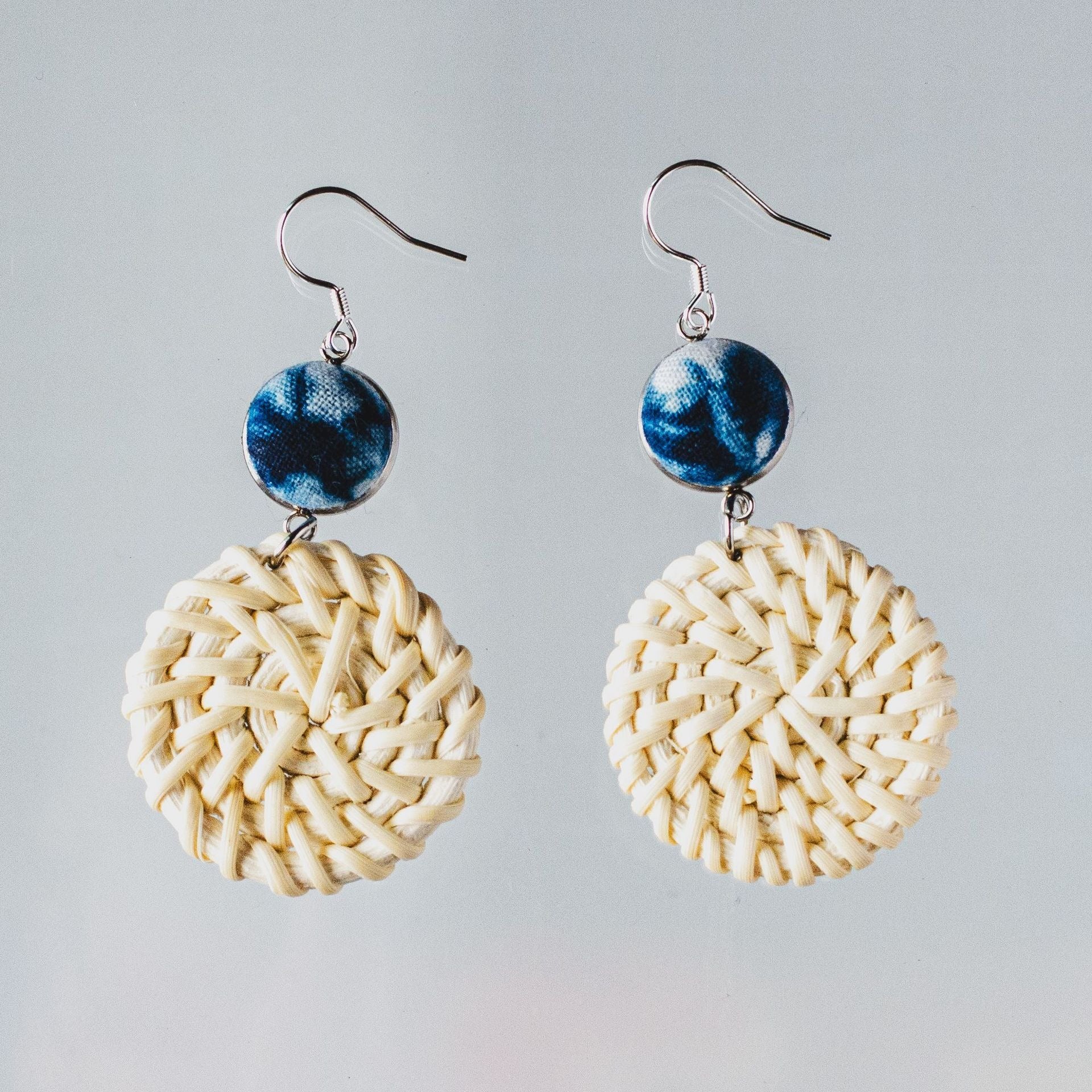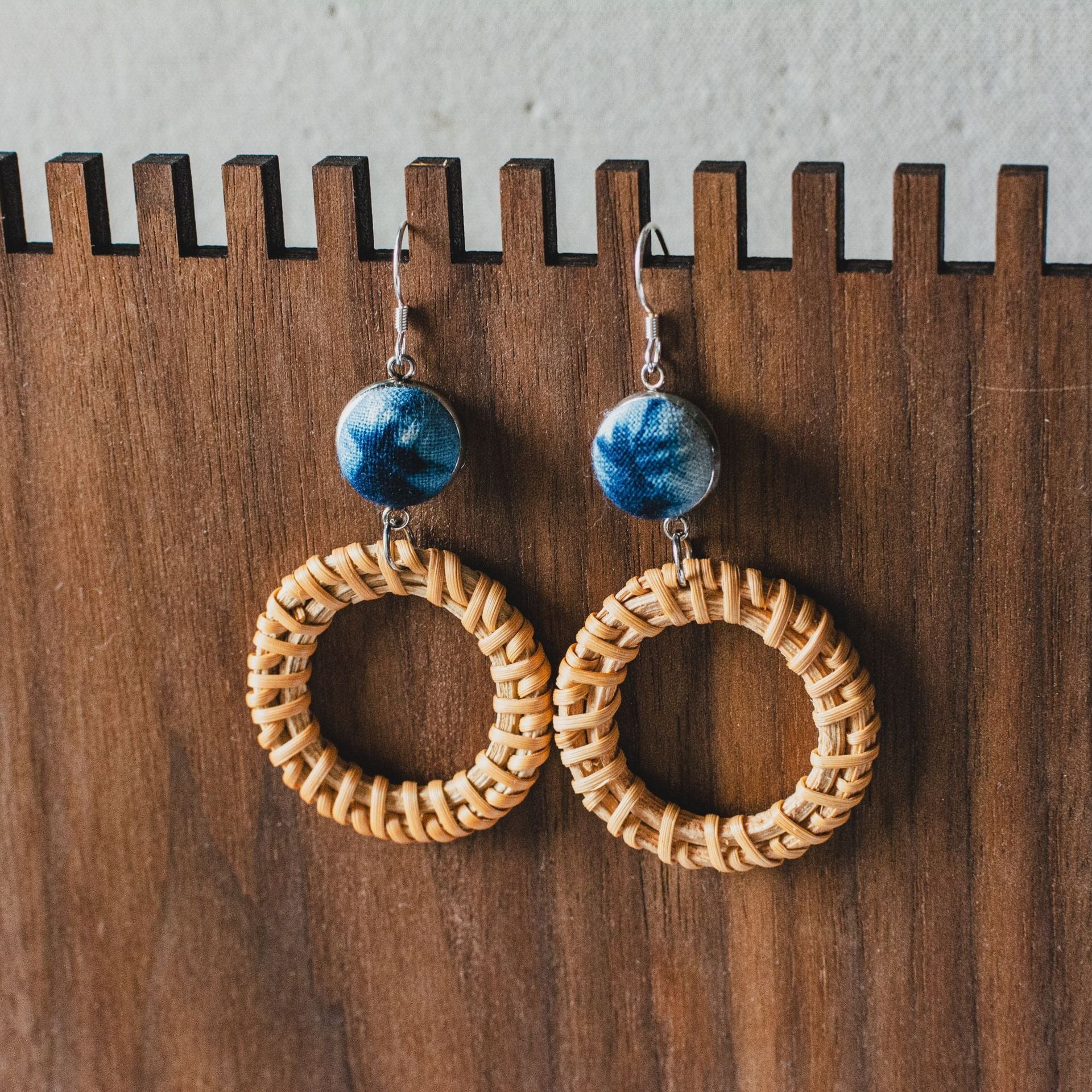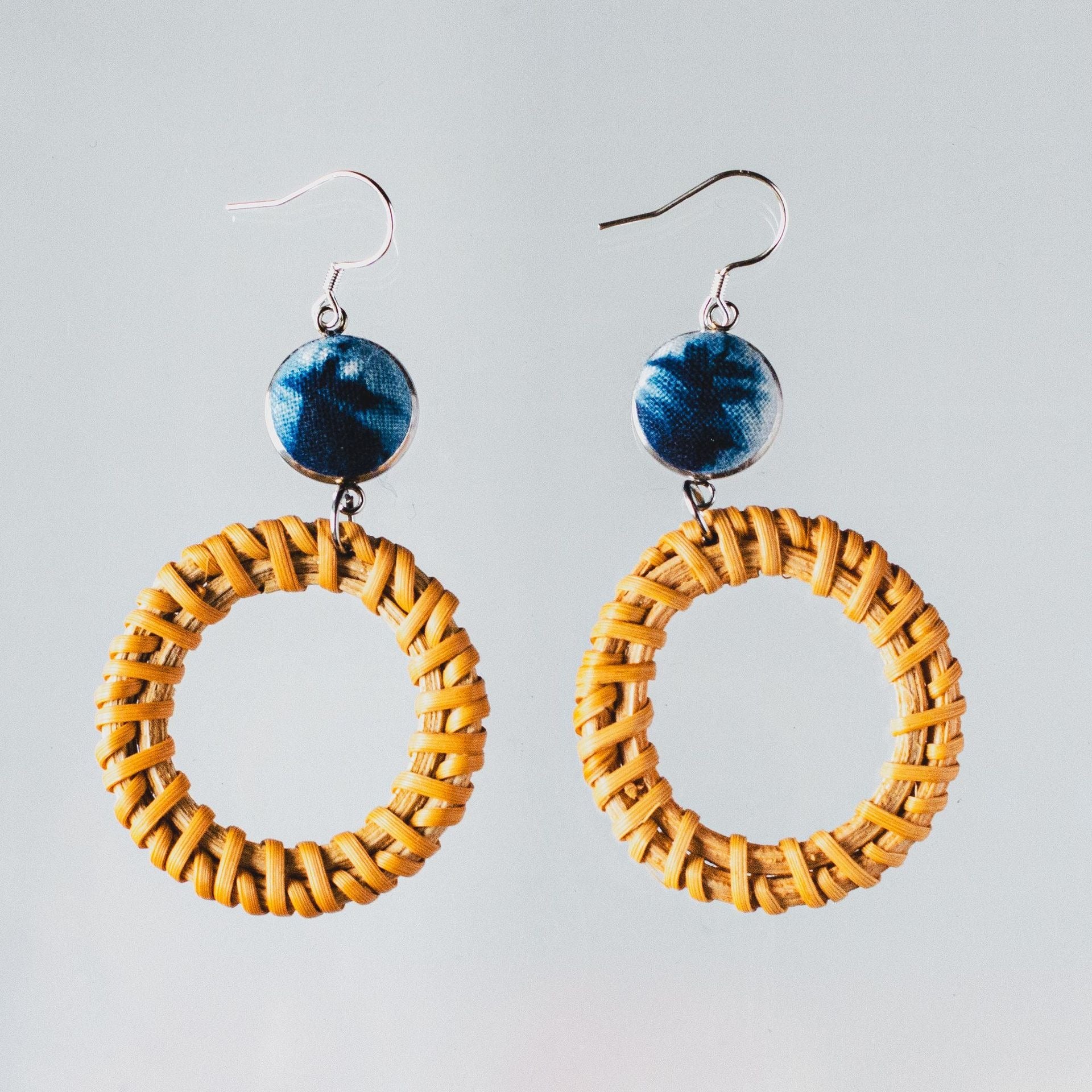 Add a warm, natural charm to your accessory collection with these beautifully handcrafted earrings. Each pair features handwoven rattan rings paired with striking indigo tie-dye fabric buttons, creating a perfect balance between earthy textures and artistic flair.