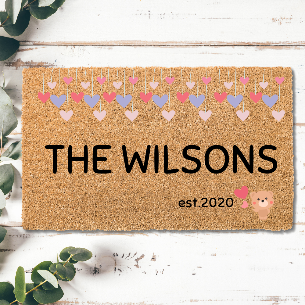 Make your entrance warm, inviting, and full of charm with our Personalized Family Name Cute Heart and Bear Welcome Mat. This delightful doormat features a playful heart and bear design, personalized with your family name and special details, making it a one-of-a-kind addition to your home.