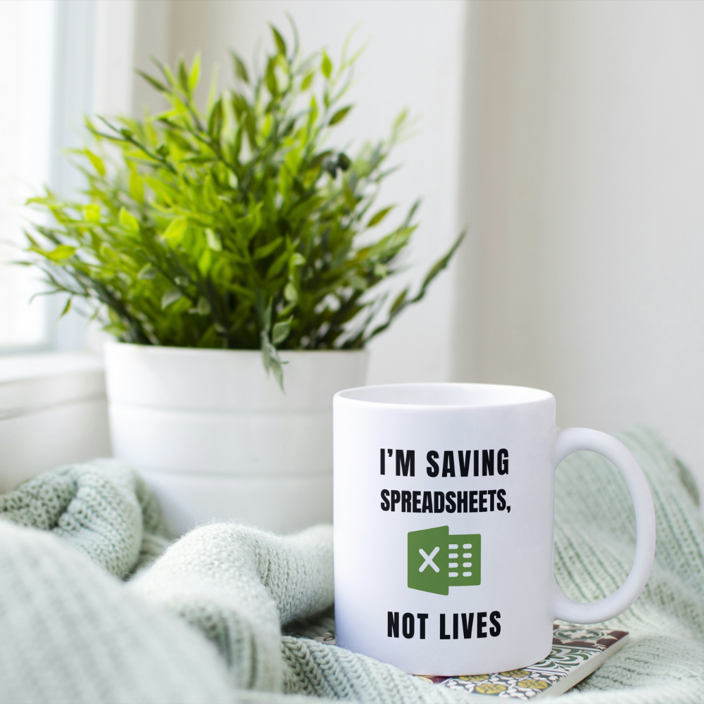 Bring a little humor to your coffee break with the Saving Spreadsheets Not Lives Funny Coffee Mug. Designed for office heroes, data wizards, and spreadsheet masters, this mug celebrates the essential yet often underappreciated skill of saving the day with numbers and formulas.