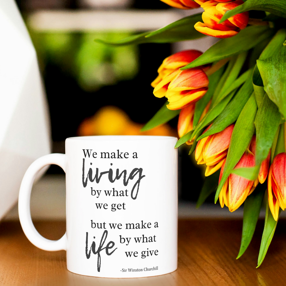 Start your day with inspiration and purpose with this beautifully designed coffee mug featuring Sir Winston Churchill’s timeless quote: “We make a living by what we get, but we make a life by what we give.” Perfect for coffee, tea, or your favorite warm beverage, this mug serves as a gentle reminder of the power of generosity and kindness.